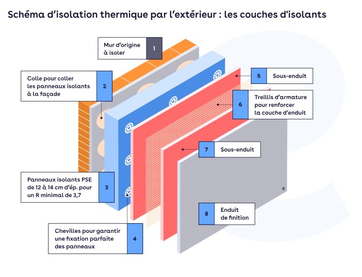 Le procédé est qu’il y a un collage de plusieurs panneaux isolants en polystyrène expansé sur la façade extérieure sur une épaisseur totale de 12 à 14 cm.